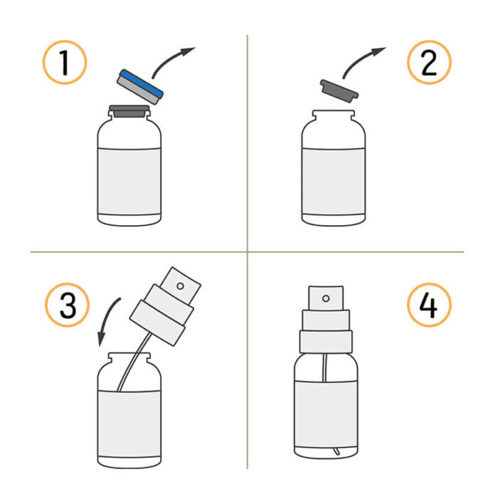 Schüttle die Flasche, entferne die Schutzkappe des Spray-Aufsatzes und sprühe 2-3x pro Tag auf Benetze die betroffene Stelle mit einer dünnen Flüssigkeitsschicht. Es sollen sich keine Tropfen ansammeln. Setze nach der Anwendung die Schutzkappe wieder auf den Spray und lagere es im Kühlschrank!